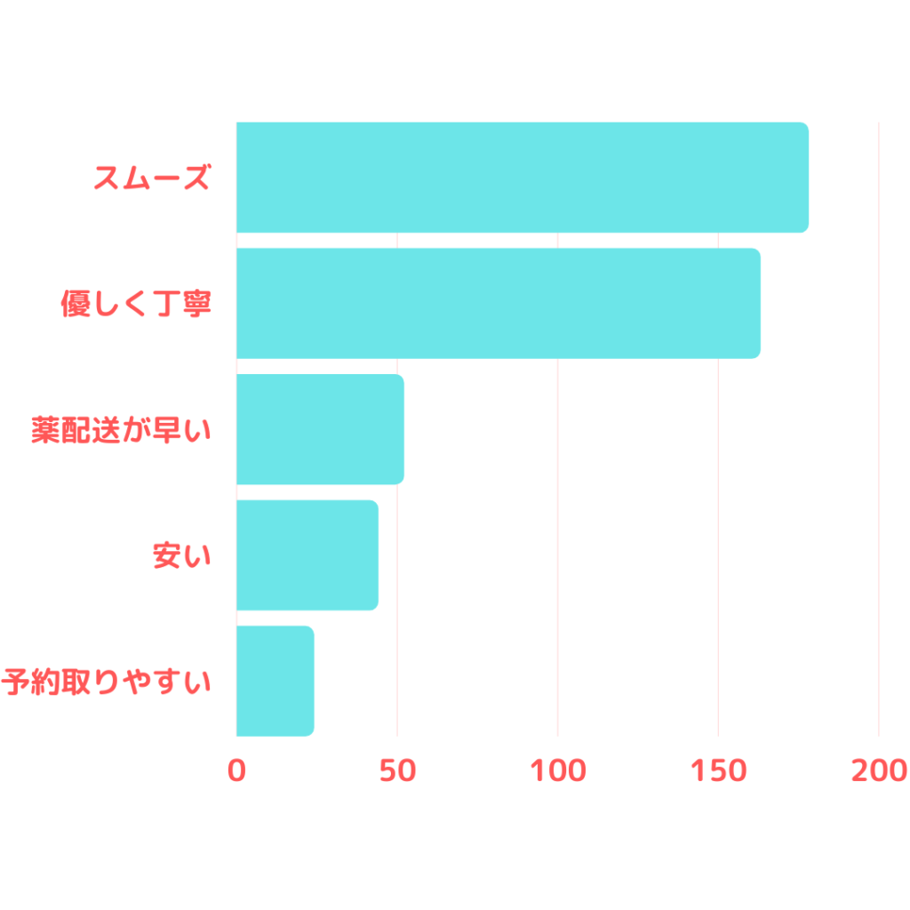 オンライン診療の「スムーズ」さを伝えるコメントが178件ともっとも多かったです。他の表現には、「対応が速い」、「スピーディー」、「時間通り」、「15分くらい」、「簡潔」などが使われていました。