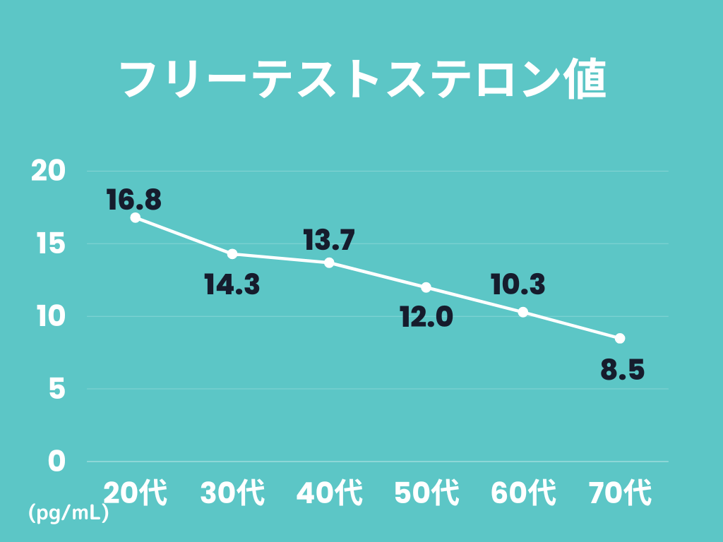 このフリーテストステロンは、女性のエストロゲンと異なり、減少スピードは全年齢を通して緩やかで70代になっても20代の半分以下にはなりません。