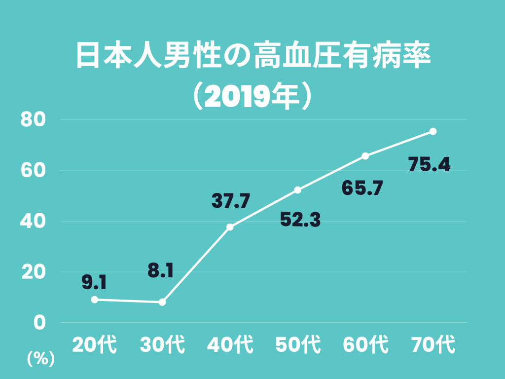 高血圧は、「国民病」といわれるほど多い病気です。年齢とともに急増し、50代になると半数以上の男性が高血圧とされます。